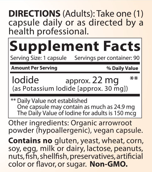 Iodide is one of the most important minerals to take daily. Not only is iodine a critical element for the brain, hormones, eyes, bones, teeth, and nails, but it also helps the body detoxify fluoride.* This product is designed for daily use for adults for the purpose of detoxifying and supporting those who might be deficient. At only 11 cents a day, it is something everyone should be taking. (Small kids should take a lower amount.)
